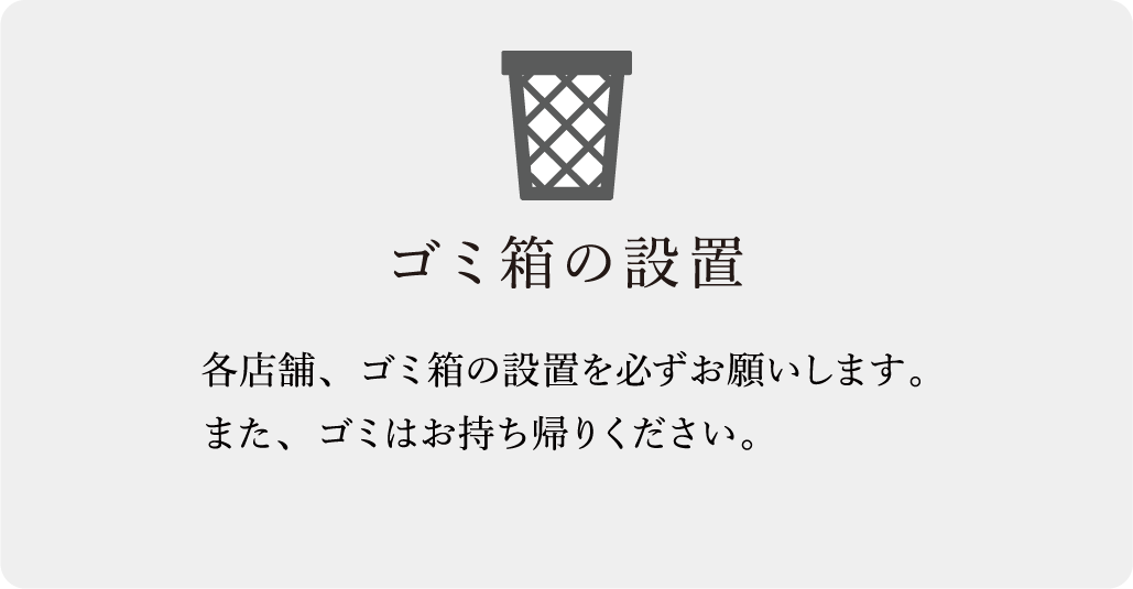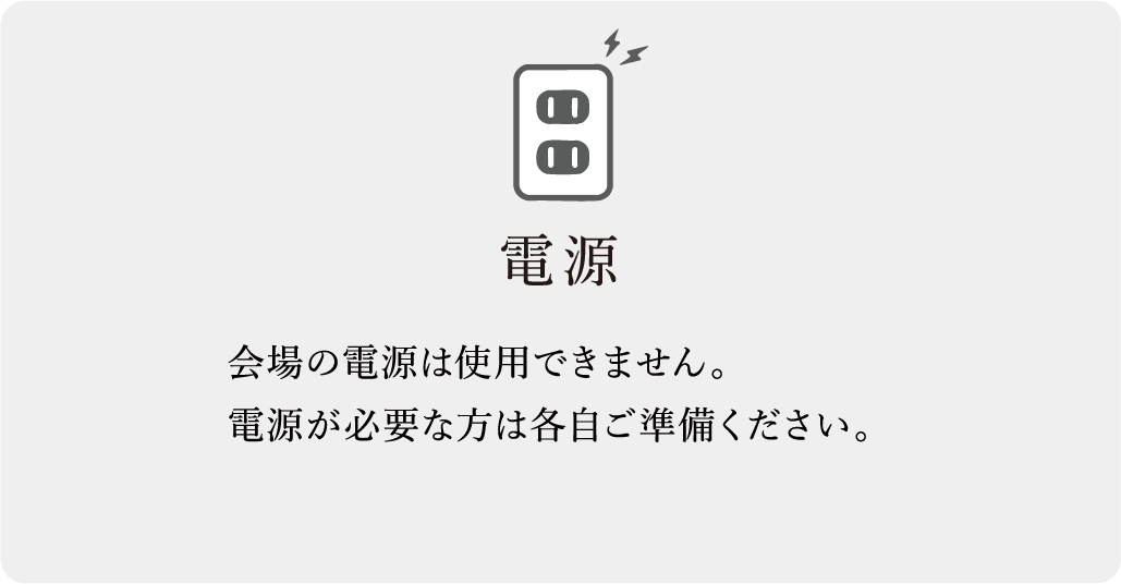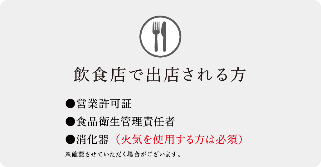 当日やむを得ない事情以外で出店キャンセルをされた場合、今後の出店をお断りさせていただきます。告知活動をしていく上で、施設の信用性を最優先させていただきますので、予めご了承ください。